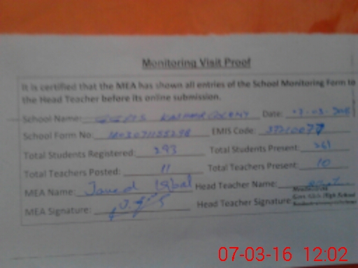 | Attendance Register | Head Teacher | MEA with School | Visit Proof |