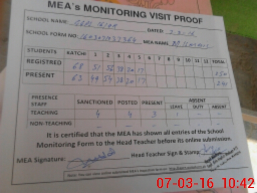 | Attendance Register | Head Teacher | MEA with School | Visit Proof |