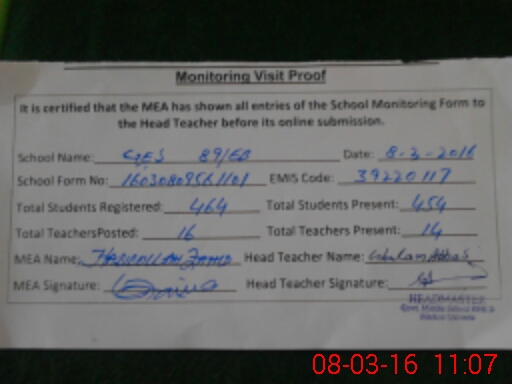 | Attendance Register | Head Teacher | MEA with School | Visit Proof |