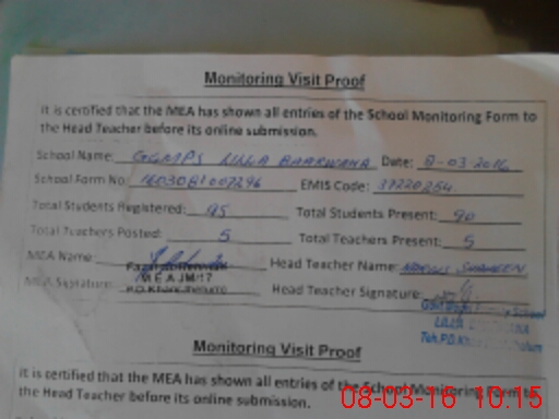 | Attendance Register | Head Teacher | MEA with School | Visit Proof |