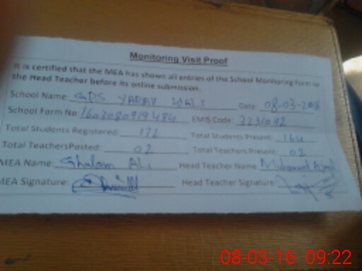 | EMIS Code: 32310112 | Name of School: GPS YARAY WALI | |||