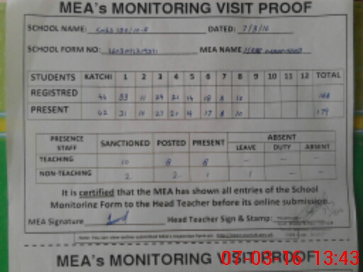 | Attendance Register | Head Teacher | MEA with School | Visit Proof |