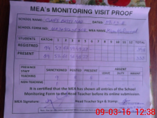 | Attendance Register | Head Teacher | MEA with School | Visit Proof |