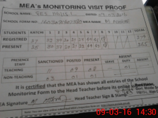 | Attendance Register | Head Teacher | MEA with School | Visit Proof |