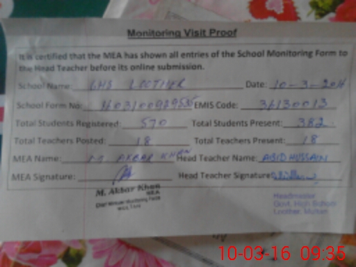 | EMIS Code: 36130013 | Name of School: GHS LOOTHER MULTAN | |||
