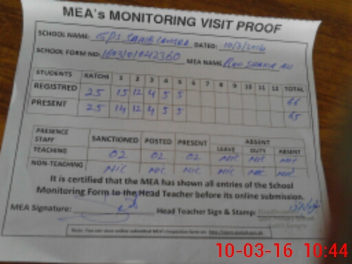 | Attendance Register | Head Teacher | MEA with School | Visit Proof |