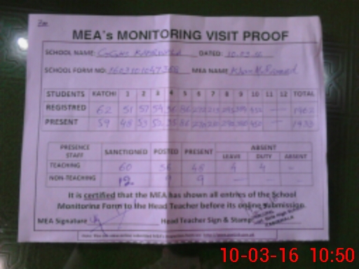 | Attendance Register | Head Teacher | MEA with School | Visit Proof |