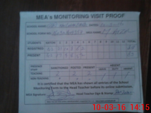 | Attendance Register | Head Teacher | MEA with School | Visit Proof |