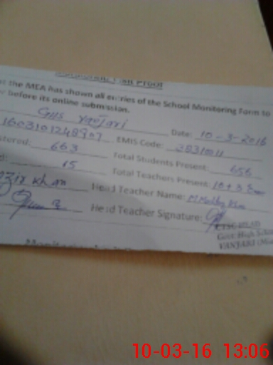 | EMIS Code: 38310011 | Name of School: GHS VANJARI | |||