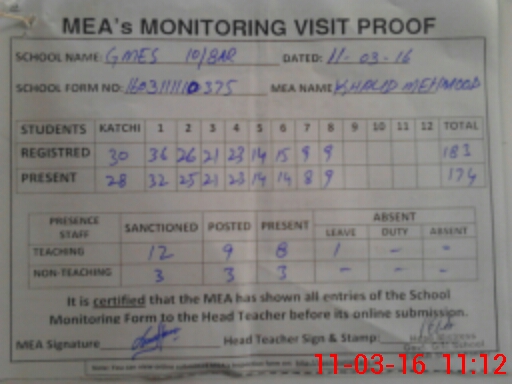 | Attendance Register | Head Teacher | MEA with School | Visit Proof |