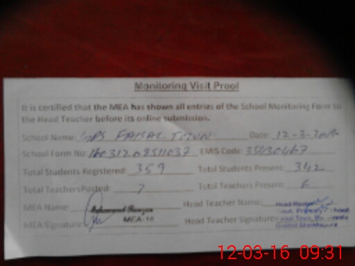 | EMIS Code: 35430467 | Name of School: GPS FAISAL TOWN | |||