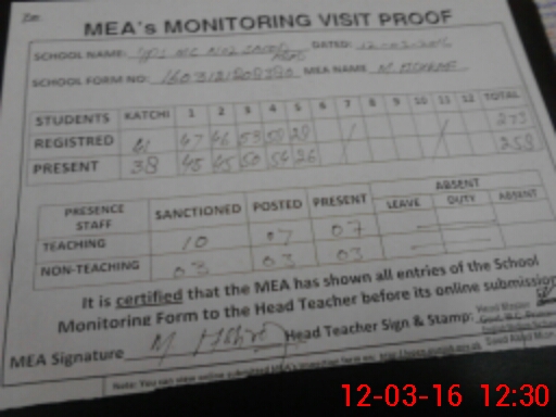 | Attendance Register | Head Teacher | MEA with School | Visit Proof |