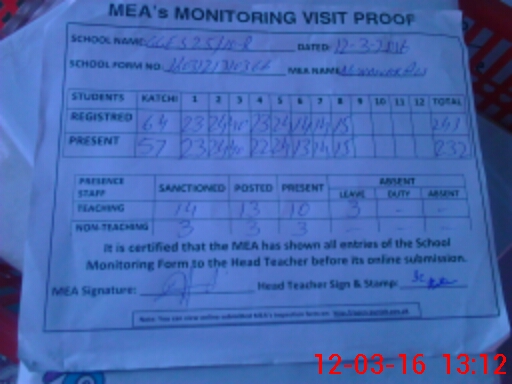 | Attendance Register | Head Teacher | MEA with School | Visit Proof |
