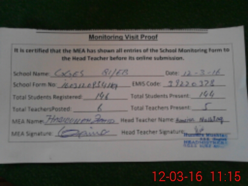 | Attendance Register | Head Teacher | MEA with School | Visit Proof |