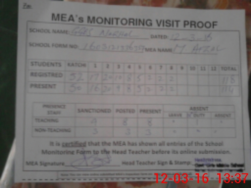 | Attendance Register | Head Teacher | MEA with School | Visit Proof |