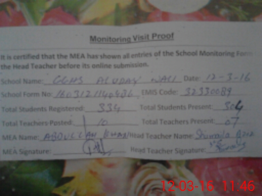 | EMIS Code: 32330089 | Name of School: GGHS ALODAY WALI | |||