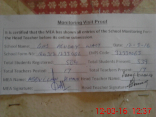 | Attendance Register | Head Teacher | MEA with School | Visit Proof |