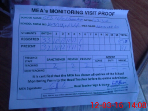 | Attendance Register | Head Teacher | MEA with School | Visit Proof |