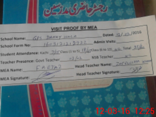 | Attendance Register | Head Teacher | MEA with School | Visit Proof |