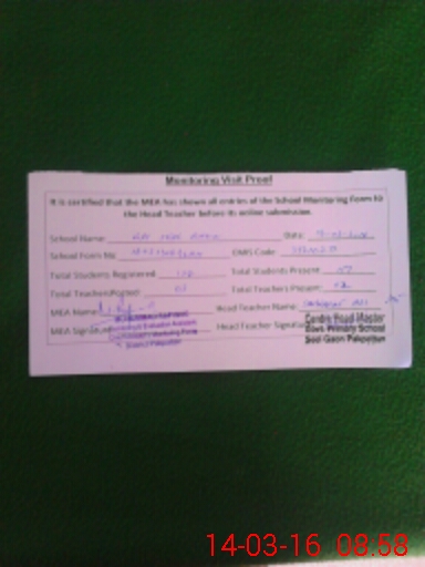 | Attendance Register | Head Teacher | MEA with School | Visit Proof |