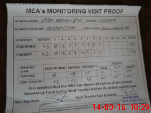 | Attendance Register | Head Teacher | MEA with School | Visit Proof |