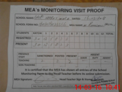 | Attendance Register | Head Teacher | MEA with School | Visit Proof |