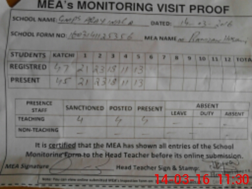 | Attendance Register | Head Teacher | MEA with School | Visit Proof |