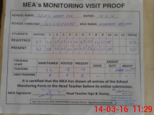 | Attendance Register | Head Teacher | MEA with School | Visit Proof |