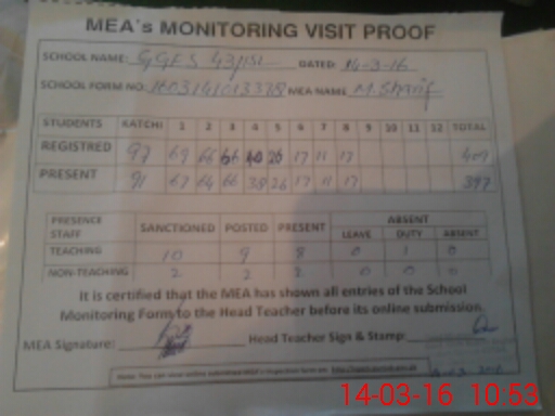 | Attendance Register | Head Teacher | MEA with School | Visit Proof |