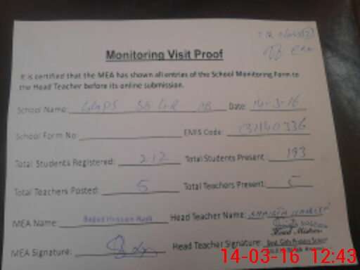 | Attendance Register | Head Teacher | MEA with School | Visit Proof |