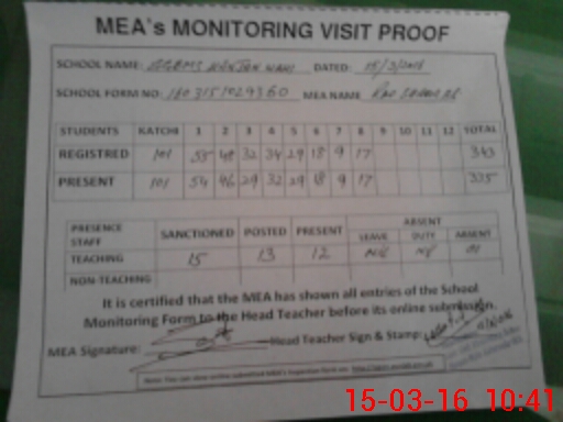 | Attendance Register | Head Teacher | MEA with School | Visit Proof |