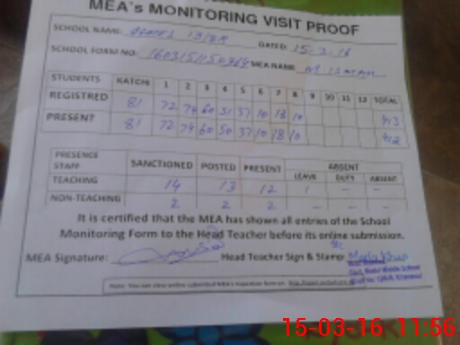 | Attendance Register | Head Teacher | MEA with School | Visit Proof |