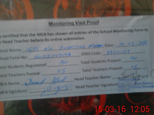 | Attendance Register | Head Teacher | MEA with School | Visit Proof |