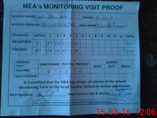 | Attendance Register | Head Teacher | MEA with School | Visit Proof |