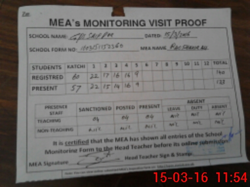 | Attendance Register | Head Teacher | MEA with School | Visit Proof |