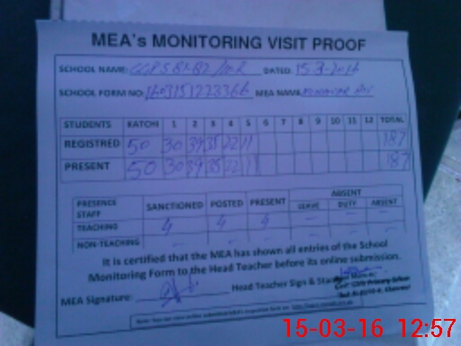 | Attendance Register | Head Teacher | MEA with School | Visit Proof |