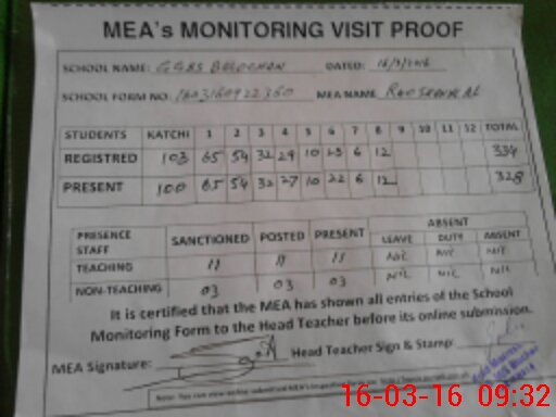 | Attendance Register | Head Teacher | MEA with School | Visit Proof |
