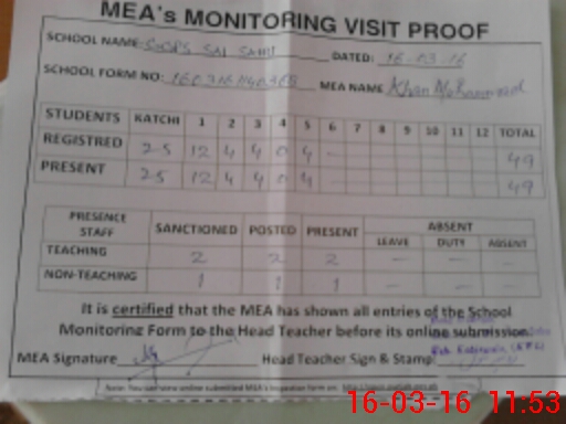 | Attendance Register | Head Teacher | MEA with School | Visit Proof |