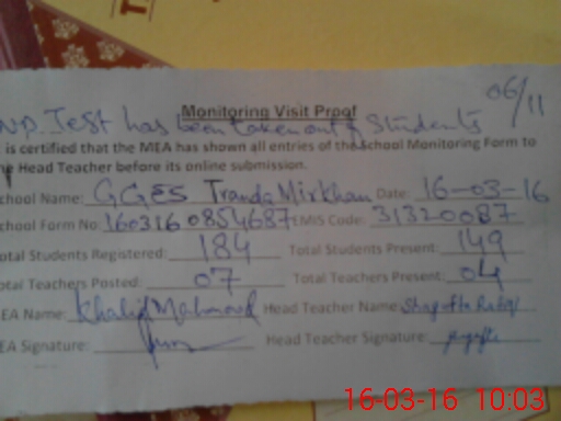 | Certified that this School was Inspected by the Undersigned MEA/DMO Today and the Information Stated Above is as Per Record. | |||||