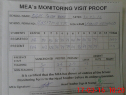| Attendance Register | Head Teacher | MEA with School | Visit Proof |