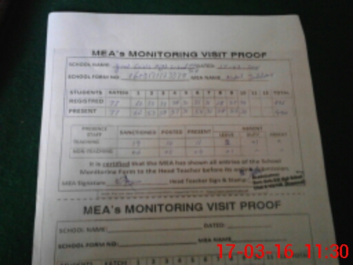 | Attendance Register | Head Teacher | MEA with School | Visit Proof |