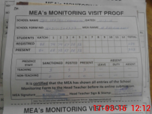 | Attendance Register | Head Teacher | MEA with School | Visit Proof |
