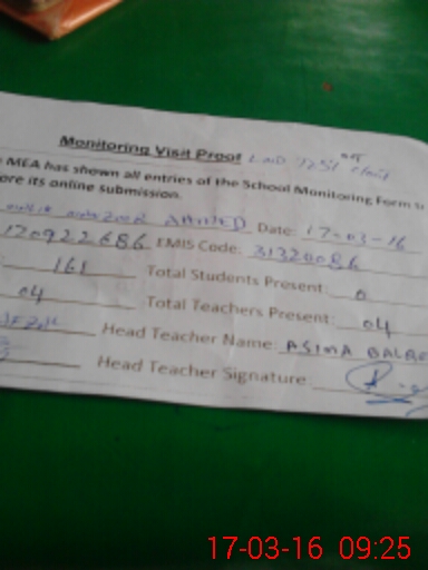 | Attendance Register | Head Teacher | MEA with School | Visit Proof |