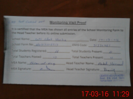 | Attendance Register | Head Teacher | MEA with School | Visit Proof |