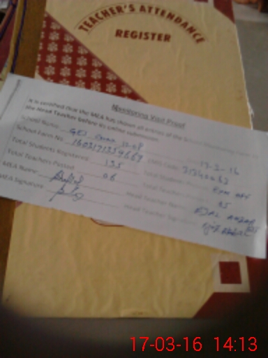 | Attendance Register | Head Teacher | MEA with School | Visit Proof |