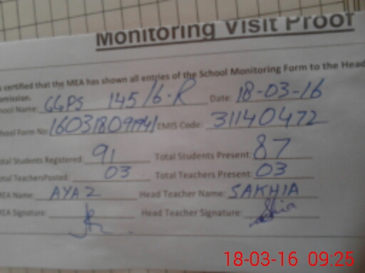 | Attendance Register | Head Teacher | MEA with School | Visit Proof |