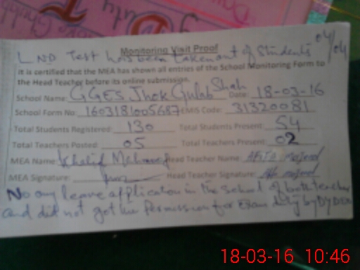 | Remarks (Use Separate Page if Required): 5TH AND 8TH CLASS ARE ON EXAM OFF AND NO ANY TYPE OF LEAVE APPLICATION PROVIDED BY THE TEACHERS SESE CHANDNI IQBAL AND SESE KHADIJA MUSTAFA AND SESE ASMA BANO DID NOT GOT THE PERMISSION FROM DY DEO FEMALE FOR EXAM DUTY WHICH WAS STARTED FROM 29 FEBRUARY 16 | |||||