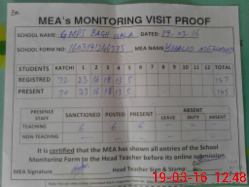 | Attendance Register | Head Teacher | MEA with School | Visit Proof |