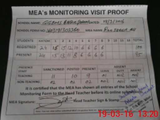 | Attendance Register | Head Teacher | MEA with School | Visit Proof |