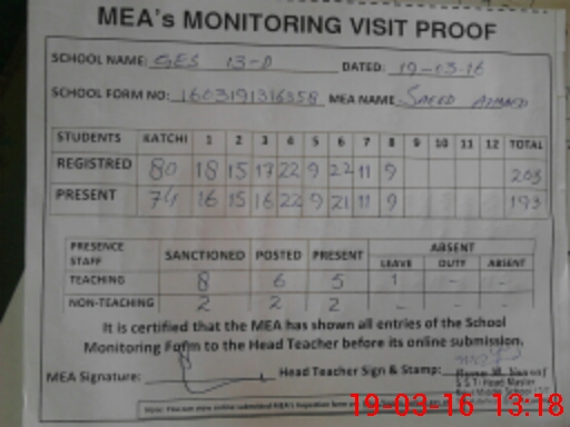 | Attendance Register | Head Teacher | MEA with School | Visit Proof |